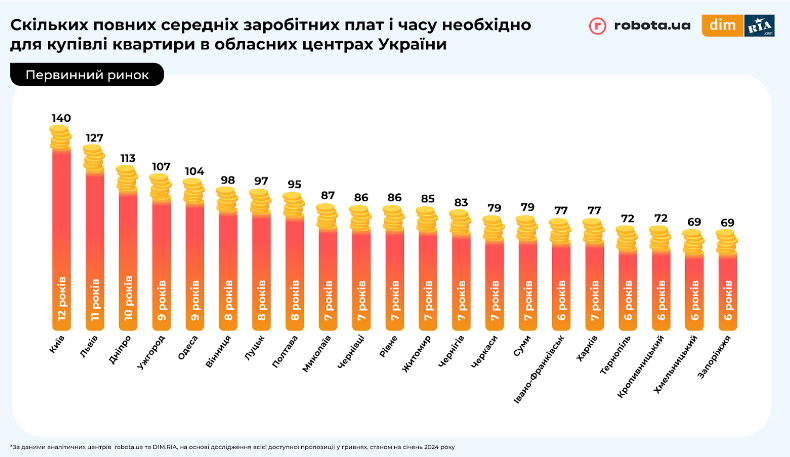 Станом на січень 2024 року найбільша середня заробітна плата фіксується у Києві – 23 600 грн. Відповідно, середня вартість однокімнатної квартири 3 299 336 грн. Згідно з вказаними даними, вартість житла складає 140 повних заробітних плат фахівця, які конвертуються у 12 років. У Львові період купівлі однокімнатного житла, орієнтуючись на середню заробітну плату, складає 11 років, а у Дніпрі – 10 років.