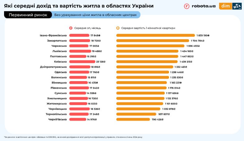 Дослідження співвідношення середніх доходів та вартості житла в областях без врахування обласних центрів показує, що у лідерах серед цін на нерухомість Івано-Франківська, Закарпатська та Черкаська області. Середня ціна однокімнатної квартири в Івано-Франківській області складає 1 839 190 грн, а заробітна плата – 17 848 грн. Відповідно для купівлі квартири потрібно 103 повних заробітні плати, що складє 9 років. У Закарпатській та Черкаській областях потрібно 8 років для купівлі житла у новобудові. Найкоротший період для купівлі зафіксовано у Чернігівській області – 5 років.