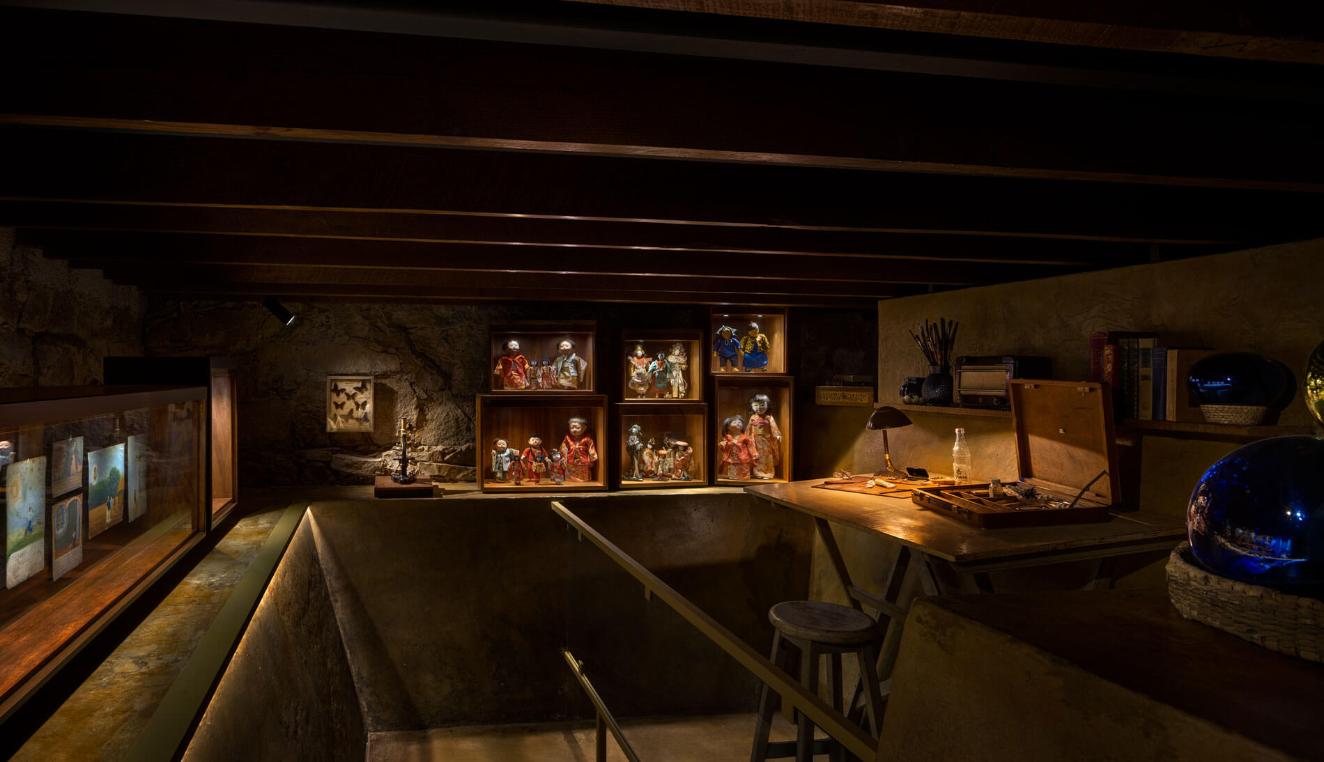 У підвалі відтворили приховану студію художниці з особистими речами, ляльками, картинами та мікроскопом для вивчення комах.