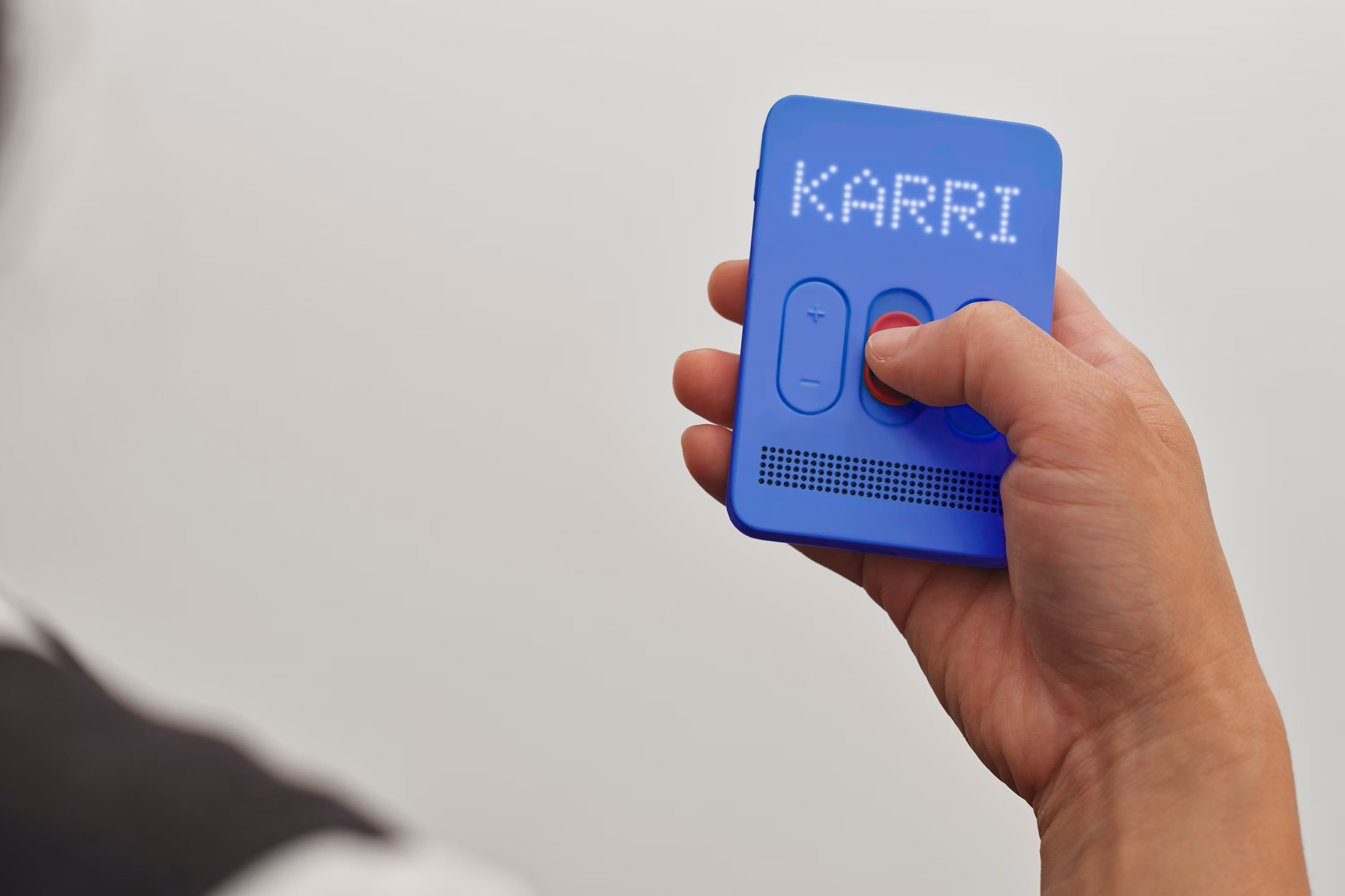 Основною кнопкою є слайдер «slide to talk»: свайп вгору — записати й надіслати повідомлення, вниз — прослухати, довге натискання — видалити. Зліва від слайдера — кнопки гучності, справа — перемикачі каналів, тобто варіантів контактів, кому можна надсилати голосові повідомлення. Замість дисплея KARRI використовує LED-матрицю з простими анімаціями.