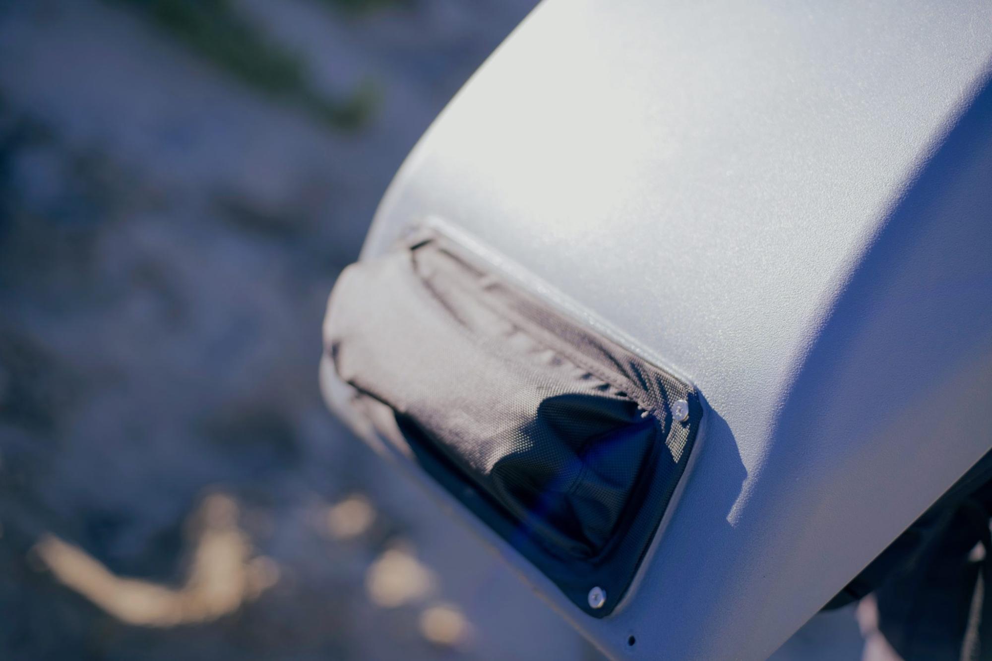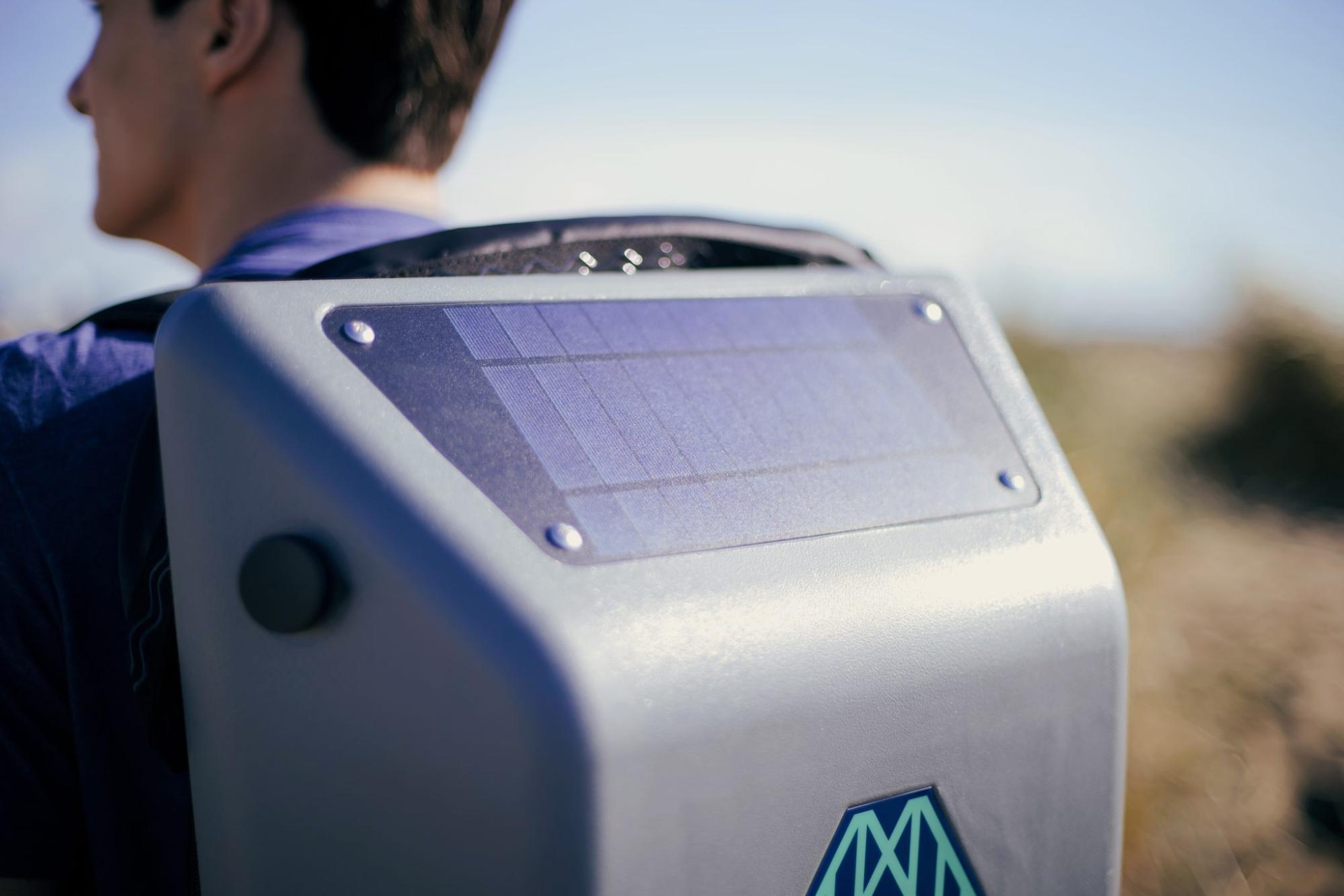 Рюкзак має жорсткий водостійкий корпус, що захищає особисті речі від дощу та бруду. У верхній частині розташована сонячна панель, яка заряджає вбудований павербанк із USB-портом — це дає змогу користуватися телефоном або іншими пристроями без доступу до електромережі. За потреби рюкзак можна зарядити і від розетки.