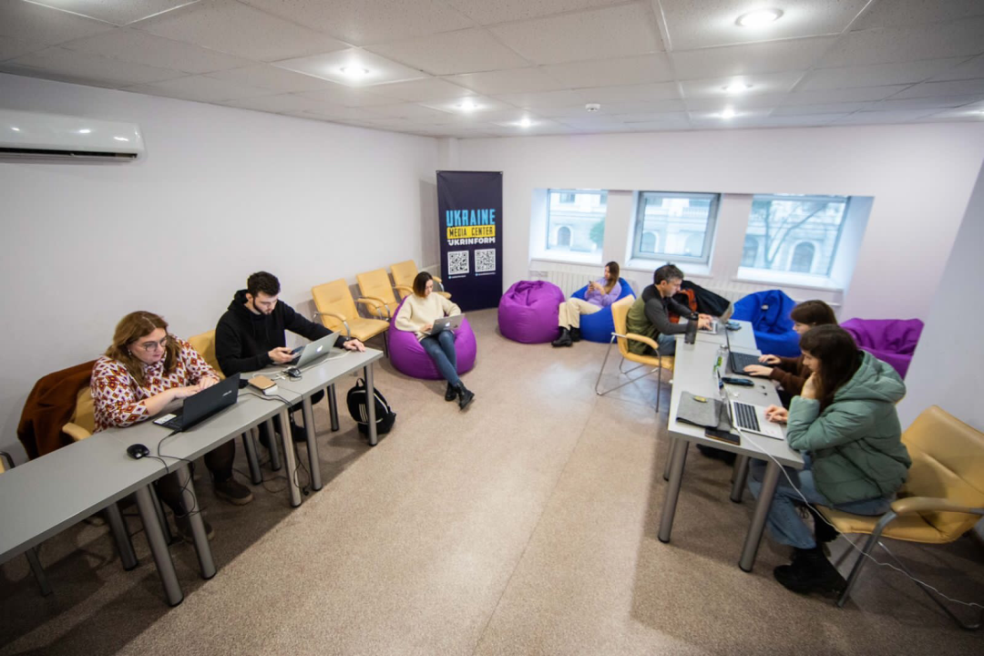 У медіацентрі інформаційної агенції “Укрінформ” облаштували безкоштовний коворкінг для журналістів. Там є столи та пуфи, стабільне освітлення, зв’язок, багато розеток. У будівлі працює буфет. На випадок повітряної тривоги є облаштоване бомбосховище.
