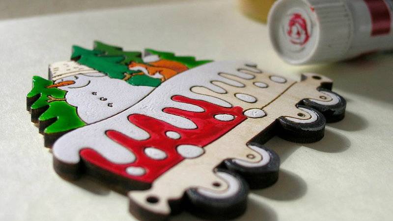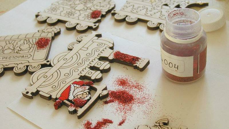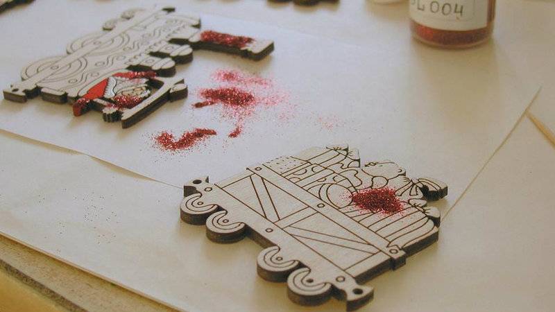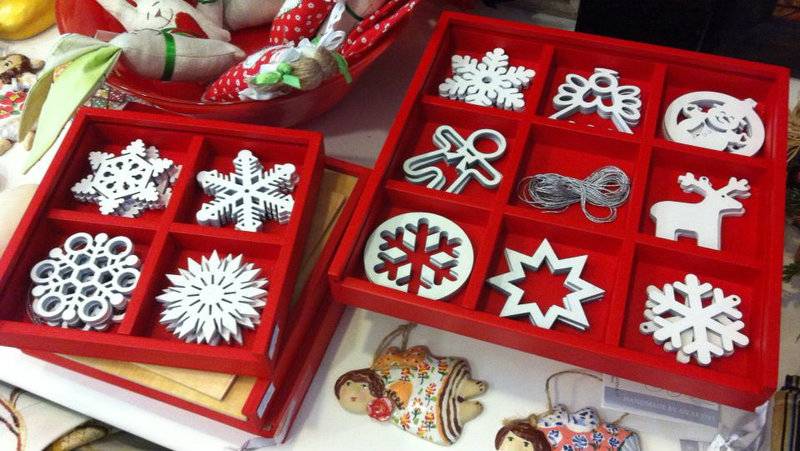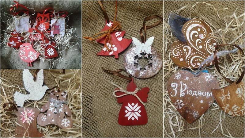 Засновниця майстерні створює іграшки в техніці декупаж. До нового року в її колекції – підвіски на ялинку з фанери різних кольорів. Все, як завжди – сніжинки, чобітки, ведмедики і зайчики. Але зроблені вручну і з душею.