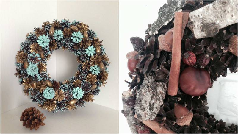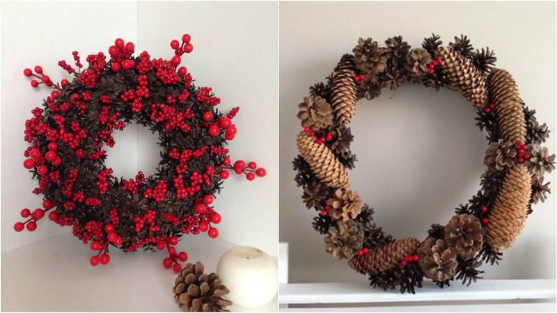 Є класичні: з натуральних шишок або лози, бутонами бавовни, або декоративними червоними ягодами. З незвичайного – вінок з кульок, що схожі на мотки ниток, або вінок, прикрашений каштанами, жолудями і паличками кориці.