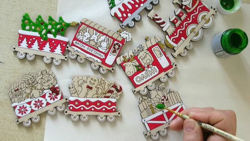 Дітям точно сподобається різдвяний поїзд, що складається з безлічі деталей. Його можна розмалювати акриловими фарбами, однак, в наборі лише 10 вагончиків і 10 підставок.