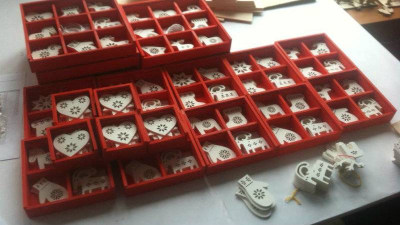 До нового року традиційно виготовили набори ялинкових прикрас з дерева. Є комплект дерев'яних іграшок з 5 штук різних кольорів на вибір: білого, чорного або червоного.