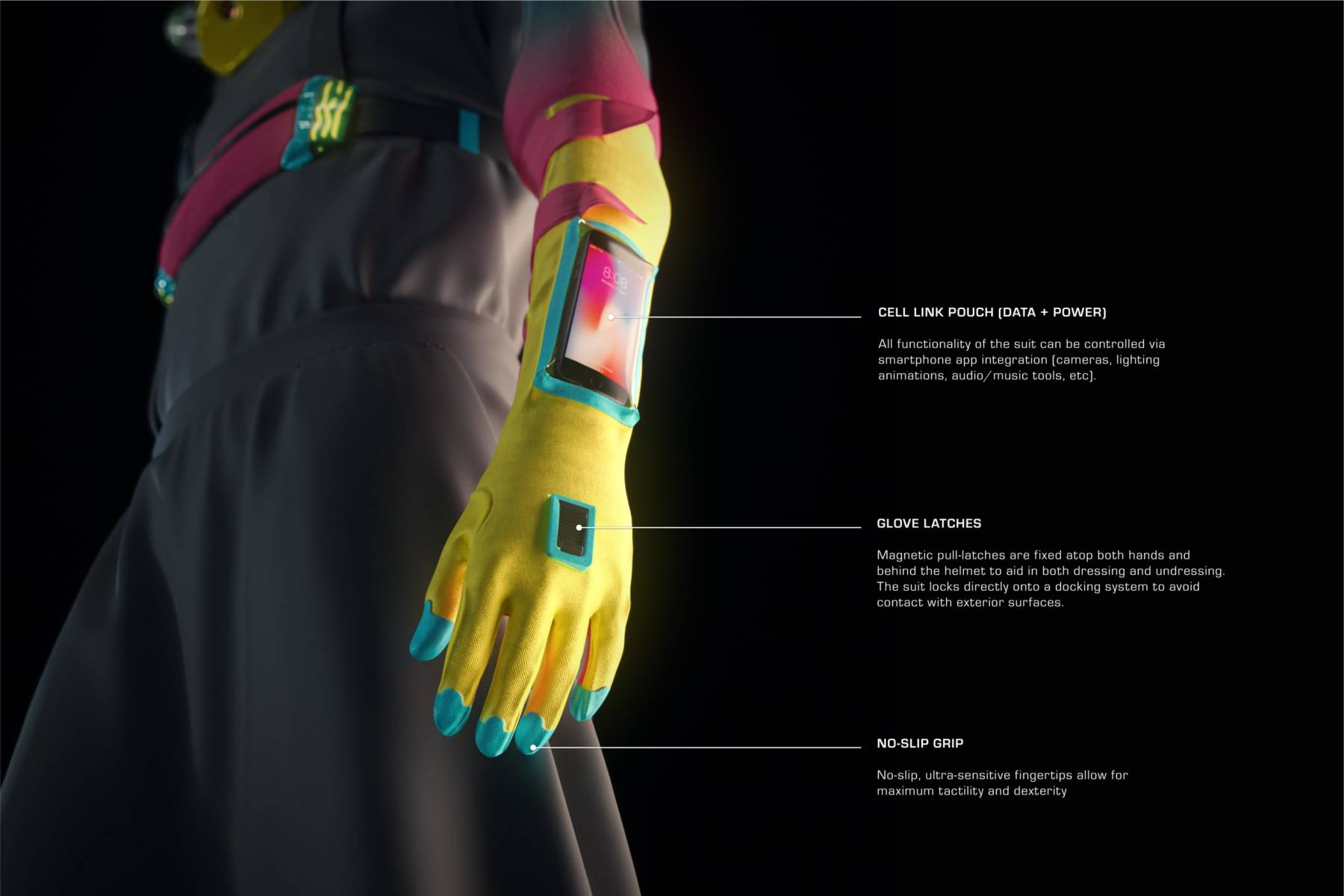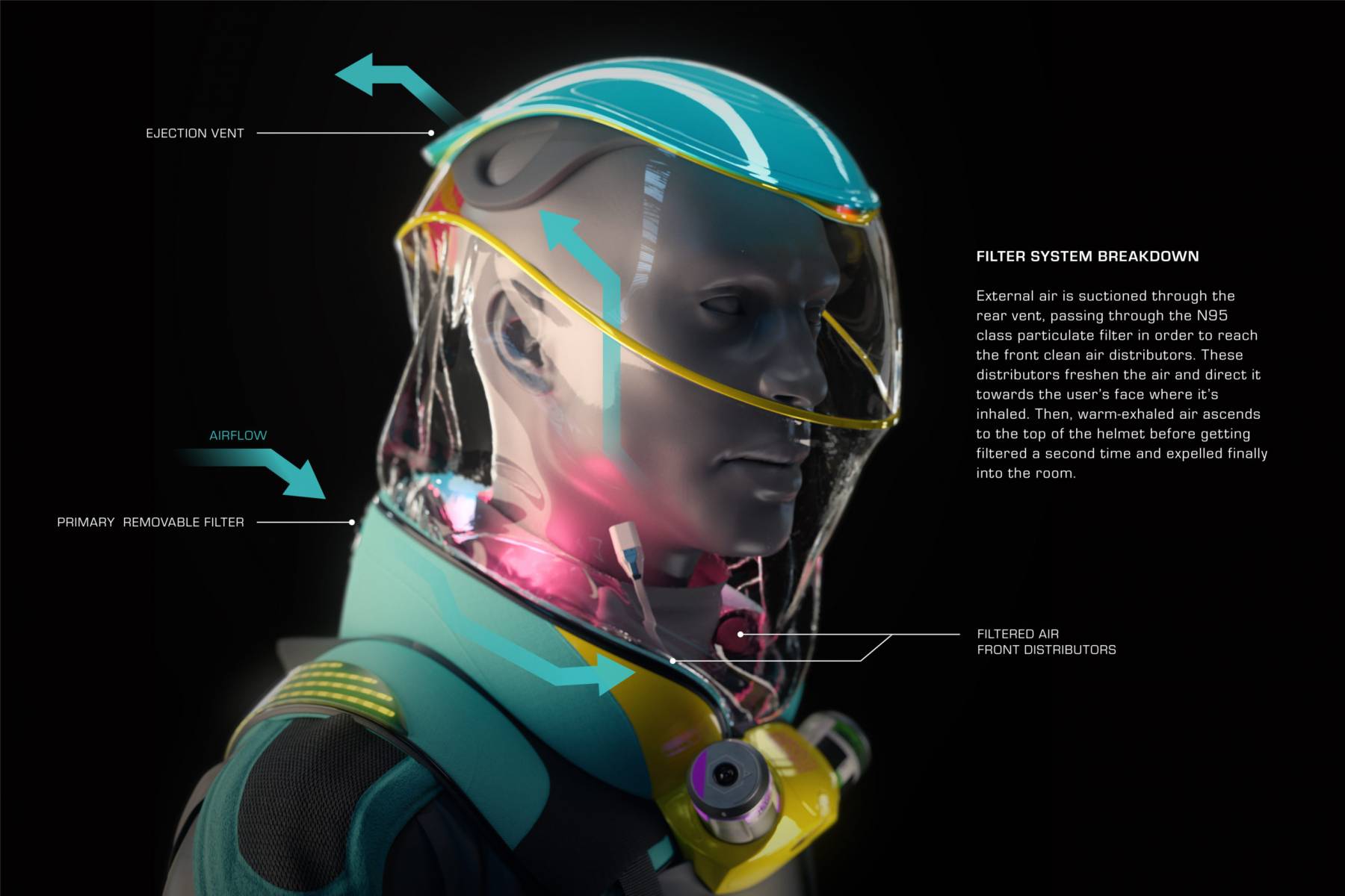 Костюм складається з прозорого шолома з вентиляцією і фільтром, сенсора температури тіла, сумки зі вбудованою системою безконтактної оплати, камери, місткості для напоїв і регульованого підсвічування. Їсти й пити у такому костюмі можна не знімаючи шолома.