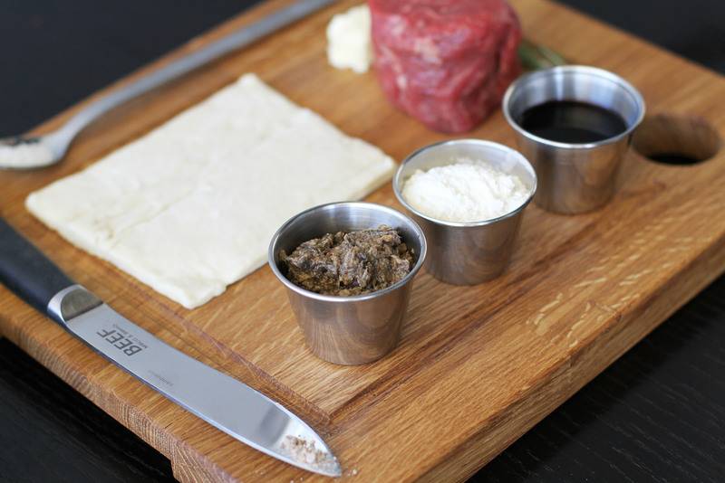 - Обсмажене м'ясо потрібно «загорнути» в шар грибної пасти, а після - в листкове тісто, після чого зверху змастити яйцем.