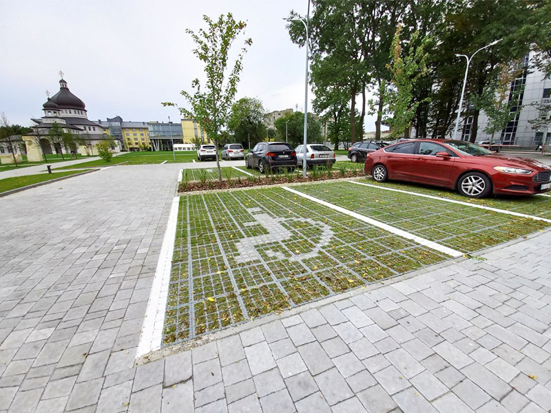 На газоні влаштували решітку для паркування автівок, у ній бруківкою позначили місця для маломобільних груп населення. Також навколо висадили дерева.
