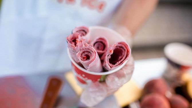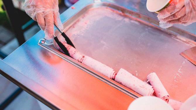 А це той самий заклад, де роблять так зване смажене морозиво, або, як його ще називають, айс-рол. Готується таке морозиво на кріо-плиті, температура якої досягає -30° С.