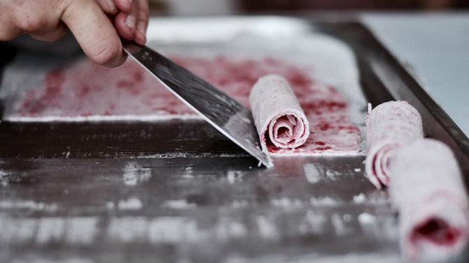 Технологія приготування досить проста: ви вибираєте основу і фруктову добавку, потім усі інгредієнти перемішуються, а утворену масу виливають на спеціальну холодну поверхню, тобто кріо-плиту. Після того як суміш замерзне, її скручують у роли і поливають сиропом або топінгом на вибір. Процес займає близько трьох хвилин, усе відбувається на очах у покупця.
