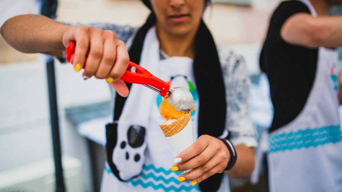 Пару кульок у вафельному ріжку тут можна як узяти з собою на винос, так і з'їсти за столиком, без поспіху поїдаючи морозиво зі скляної креманки — зовсім як у дитинстві!