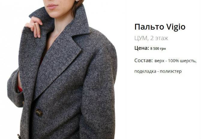 Выбранное нами пальто пошито из 100% шерсти. Однако утеплителя нет, а подкладка – совсем легкая. Это одежда не для суровых морозов, а для мягкой зимы.