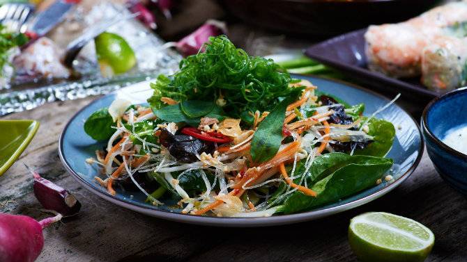 Ціни: салат з маринованою телятиною і кокосовим маслом - 145 грн; неми зі свининою - 99 грн; фреш-рол з тофу, овочами, кунжутом і бобовими паростками - 85 грн; фо-бо - 119 грн; смажений рис із куркою та овочами - 105 грн; рисова локшина з креветками - 188 грн; свинина в кисло-солодкому соусі з овочами - 165 грн