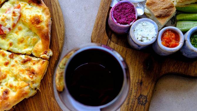 Є як класичний аджарський хачапурі з сиром і яйцем (стандартна порція 450 г, грузинська - 1 кг), так і лобіоті (човник з тіста з квасолею), аджапсандалі (човник з начинкою з овочевого рагу), чакапулі (човник з начинкою з баранини з тархуном).