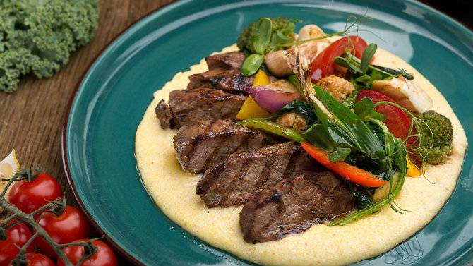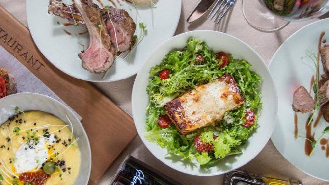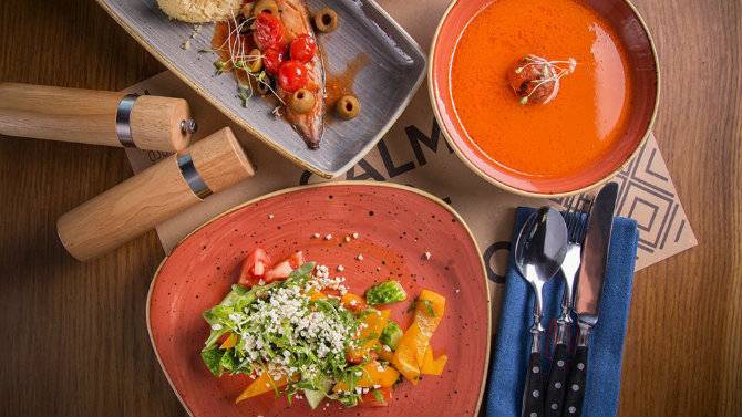 Ціни: тарілка фермерських українських сирів - 149 грн; брускети зі слабосоленою хамсою або оселедцем - 98 грн; овочевий салат із бринзою - 89 грн; чорноморська юшка з саламуром - 98 грн; томлена в молоці баранина з хумусом і овочами - 259 грн.