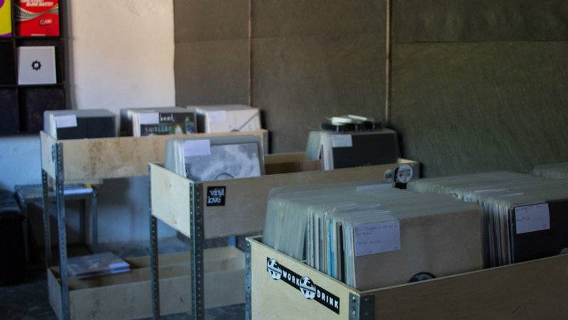 Помещение вытянутое, поэтому его решили зонировать - заказали ширму из фанеры и отделили небольшую зону библиотеки, с которой и соседствует магазин пластинок.