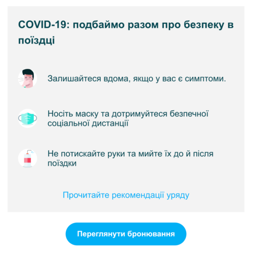 Автобусні перевезення також поступово відновлюють роботу. Квитки доступні на сайті або в додатку BlaBlaCar. Відзначається, що згідно з рішенням Міністерства охорони здоров'я, автобусні перевезення доступні тільки в тих областях, де ввели послаблення карантину. Компанії-перевізники вимагають дотримання дистанції та маскового режиму, проводять температурний скринінг і регулярну дезінфекцію салону.