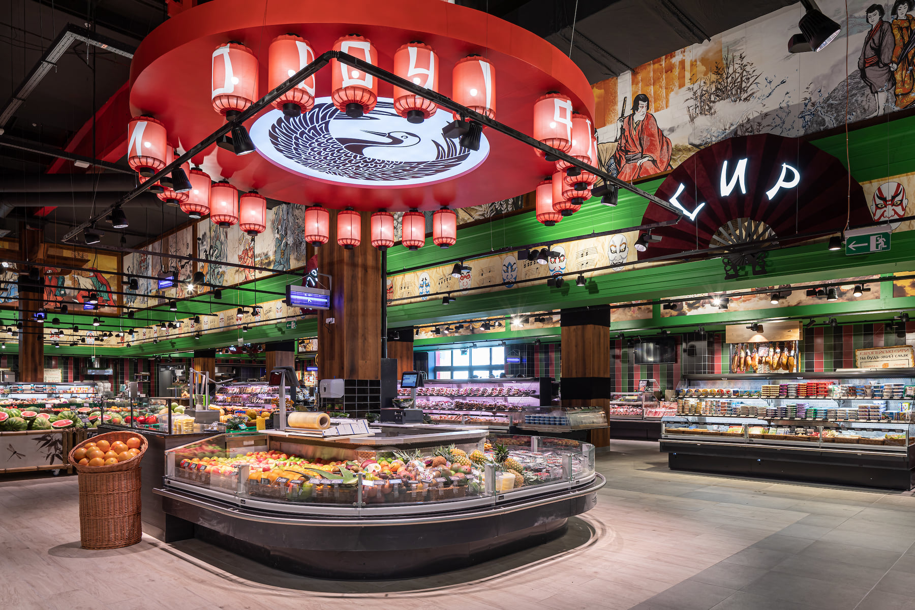Супермаркет відкрили у серпні 2021 року. В оформленні відтворили антураж традиційного японського театру із притаманною йому експресією та символічністю.