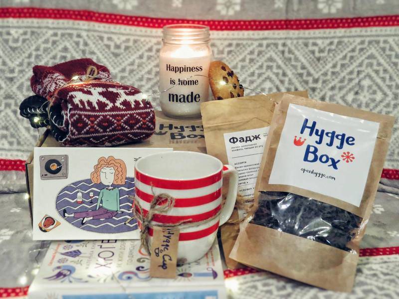 У коробочках Hygge Box помістилося дев'ять предметів українського та польського виробництва: домашні шкарпетки, чашка, чай або какао, солодощі ручної роботи, свічка, листівка, поради для досягнення hygge-ефекту разом з добіркою відповідної музики, а також знижка на подорож від Trip&Quest.