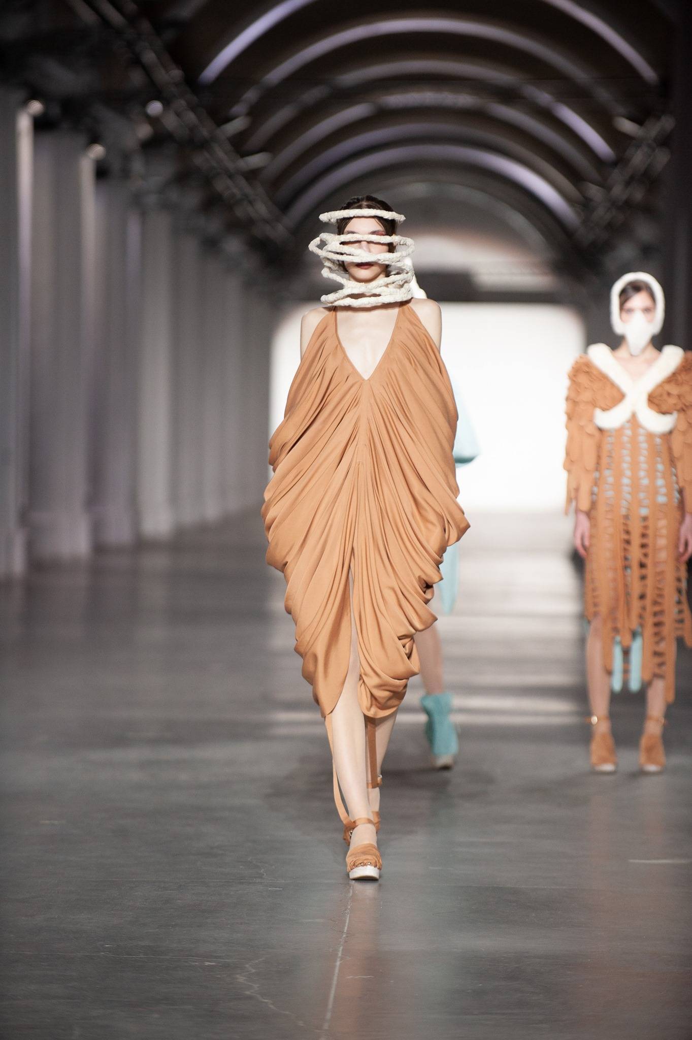 Дизайнери Ukrainian Fashion Education Group презентували одяг з біорозкладної тканини Tencel – текстильного волокна на основі деревини евкаліпта. Образи доповнені «живими» аксесуарами з міко-матеріалу, який складається з двох компонентів - міцелію (кореневої системи гриба, яка знаходиться під землею) і стебел технічних конопель.