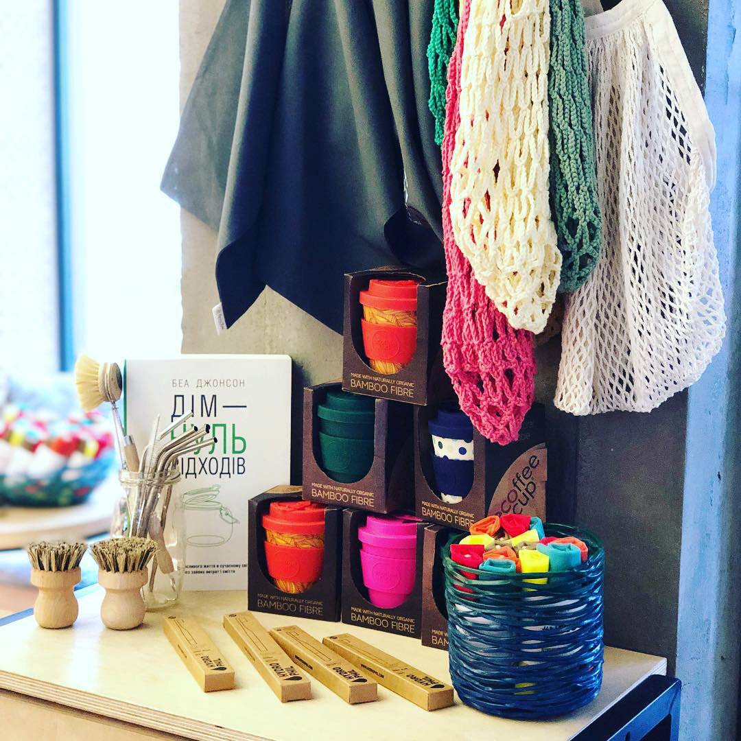 У магазині можна купити та здати на переробку речі, які зменшують кількість пластикових відходів на 100%. Серед товарів – авоськи, шопери, пляшки для води, бамбукові щітки.