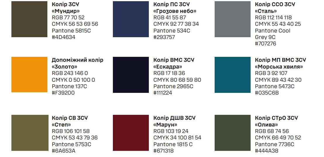 Також є усі логотипи разом із можливими та неможливими способами їх поєднання. Усе це допоможе просувати зовнішній образ ЗСУ.