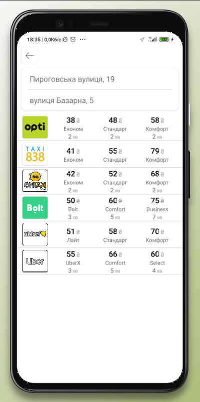 Після того, як користувач вказує свою адресу, додаток покаже перелік доступних служб таксі та ціни в кожній з них. Наразі можна порівняти ціни служб Uklon, Uber, Bolt, 838, OnTaxi і Opti.