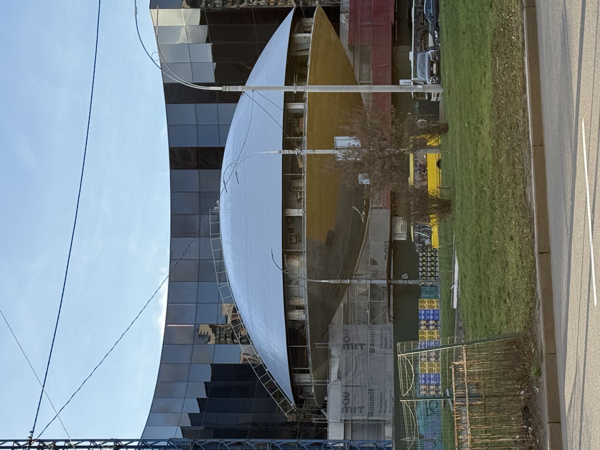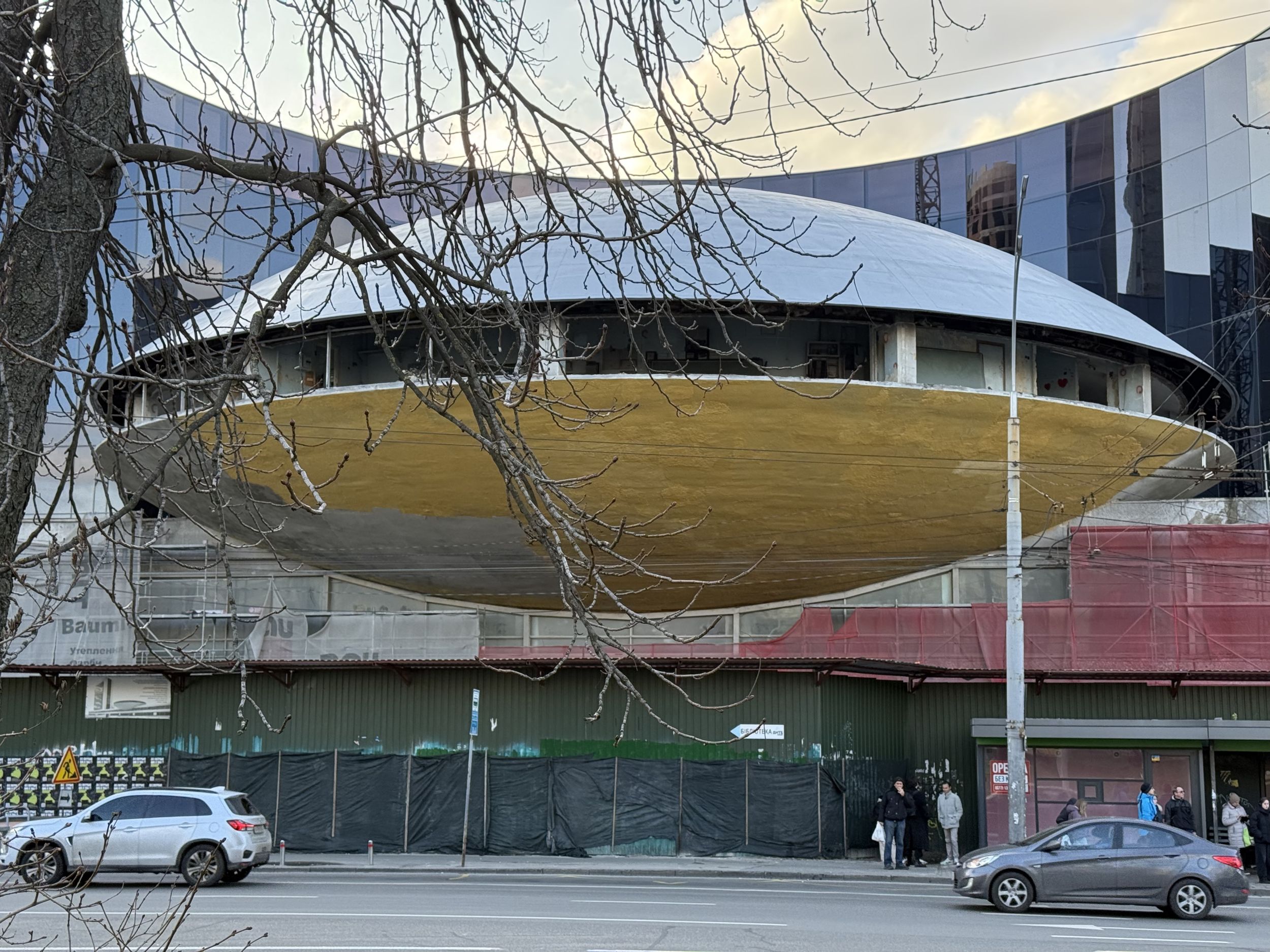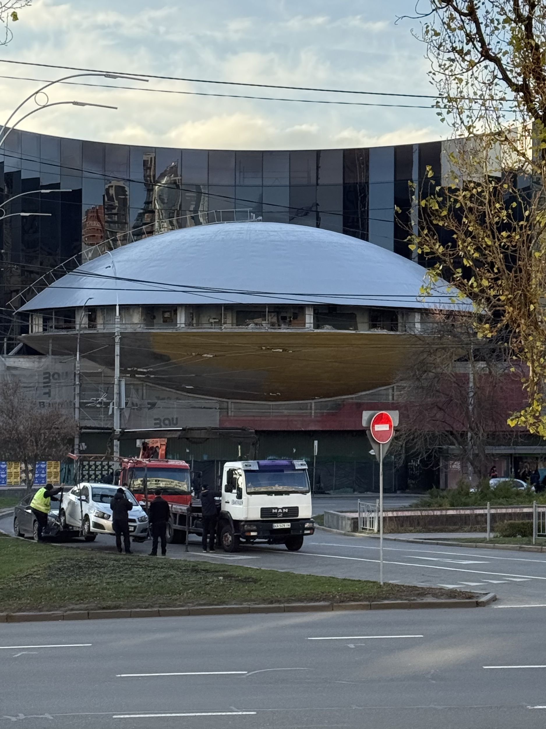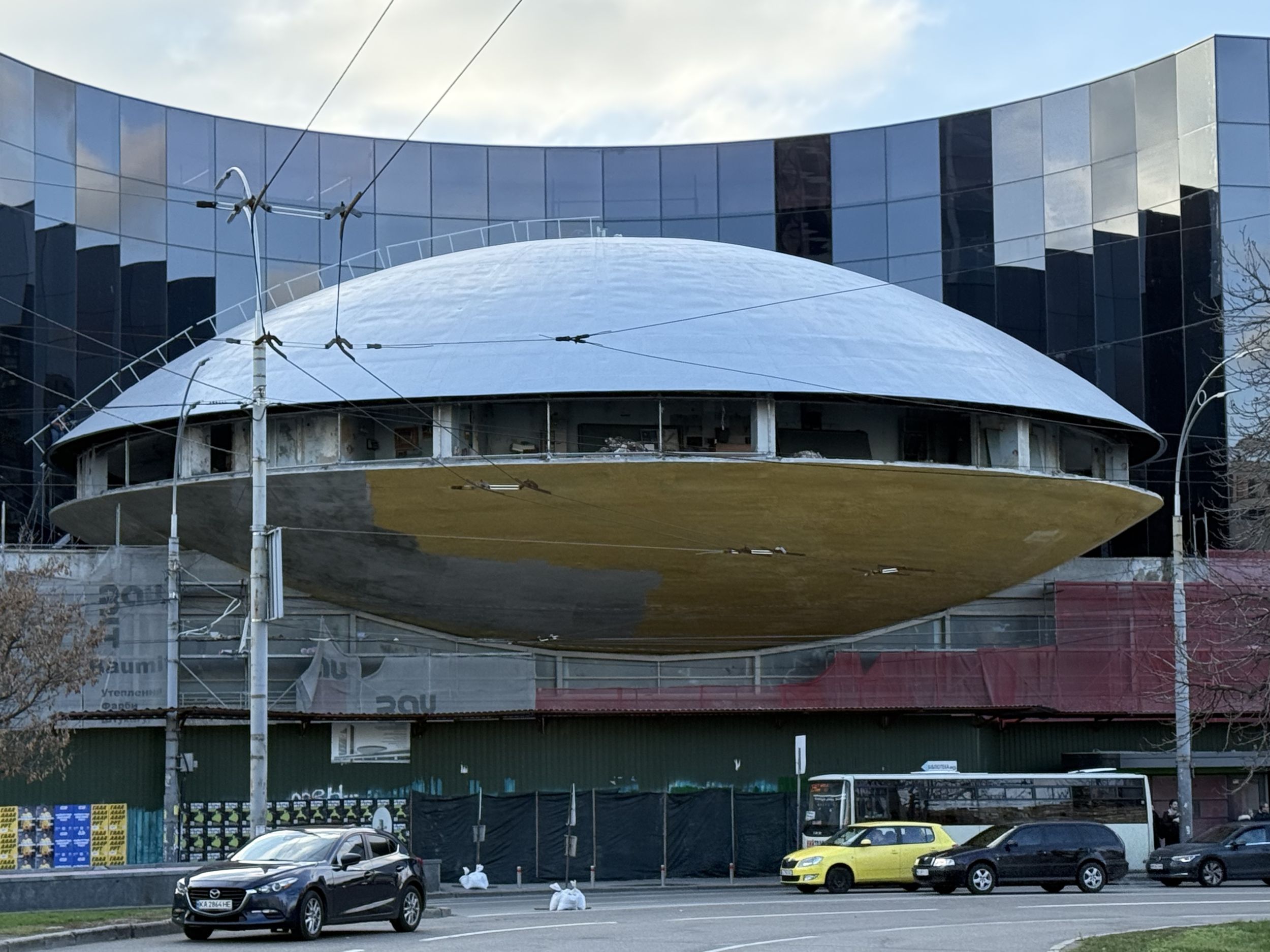 У Києві в будівлі Українського інституту науково-технічної та економічної інформації, відомій як «Літаюча тарілка», демонтували вікна.