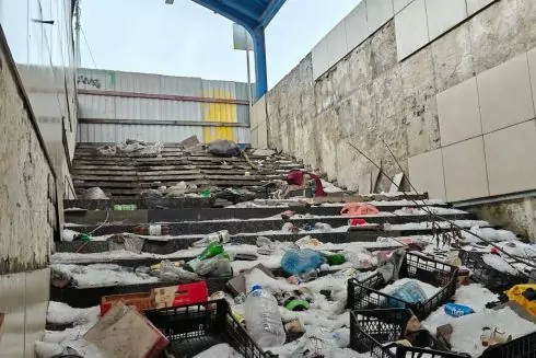 Сходи столичної станції швидкісного трамвая «Вул. Академіка Шалімова» на Відрадному завалені сміттям. Фотографії занедбаної зупинки опублікувала депутатка Київради Ксенія Семенова.