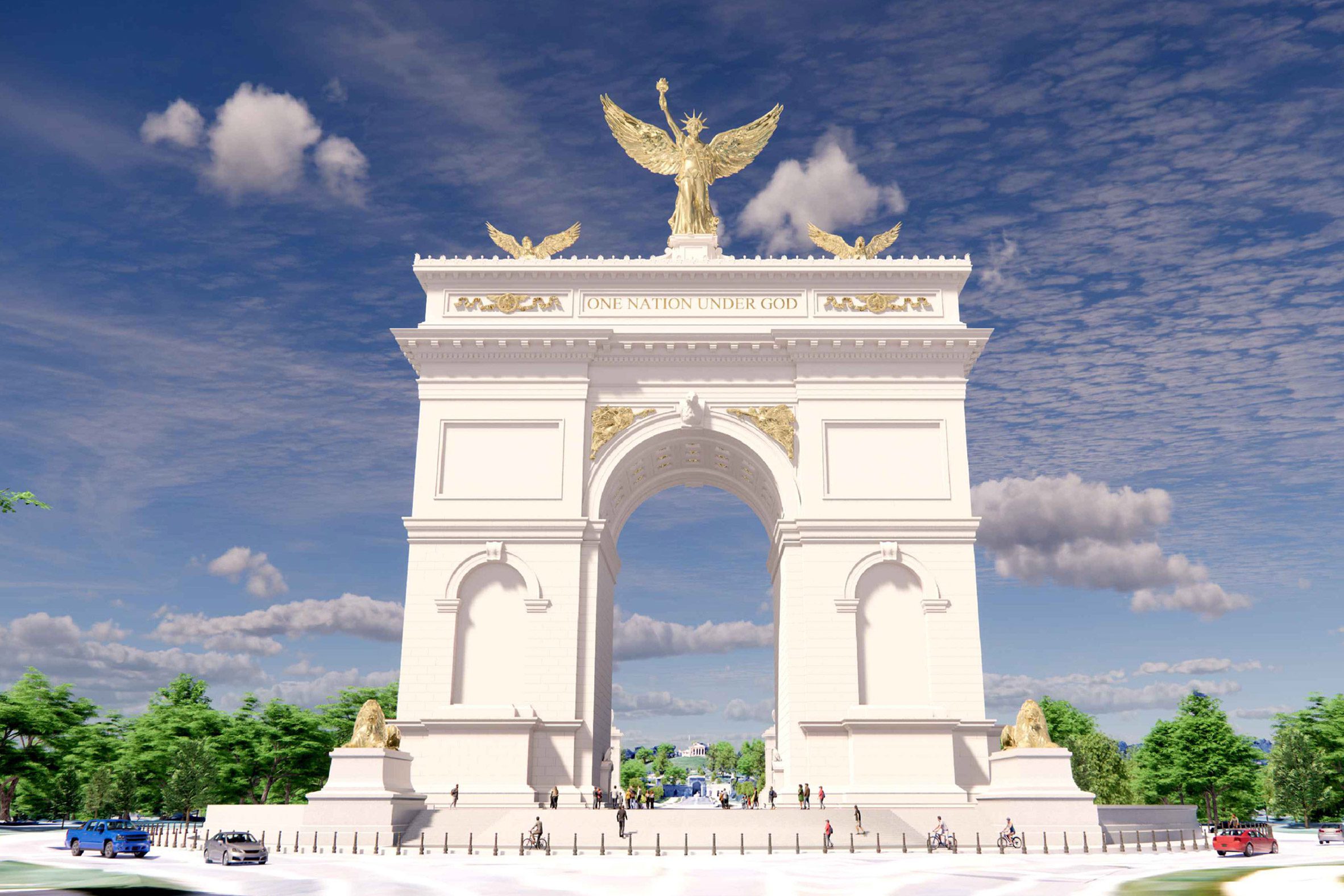 Проєкт був поданий на розгляд Комісії з образотворчого мистецтва — федеральної панелі, до складу якої президент раніше призначив своїх однодумців. Згідно з візуалізаціями, розробленими архітектурним бюро Harrison Design, споруда за стилістикою нагадує Тріумфальну арку в Парижі. Вершину конструкції прикрашають два орли та золотий крилатий ангел, якого Трамп називає «Леді Свобода».