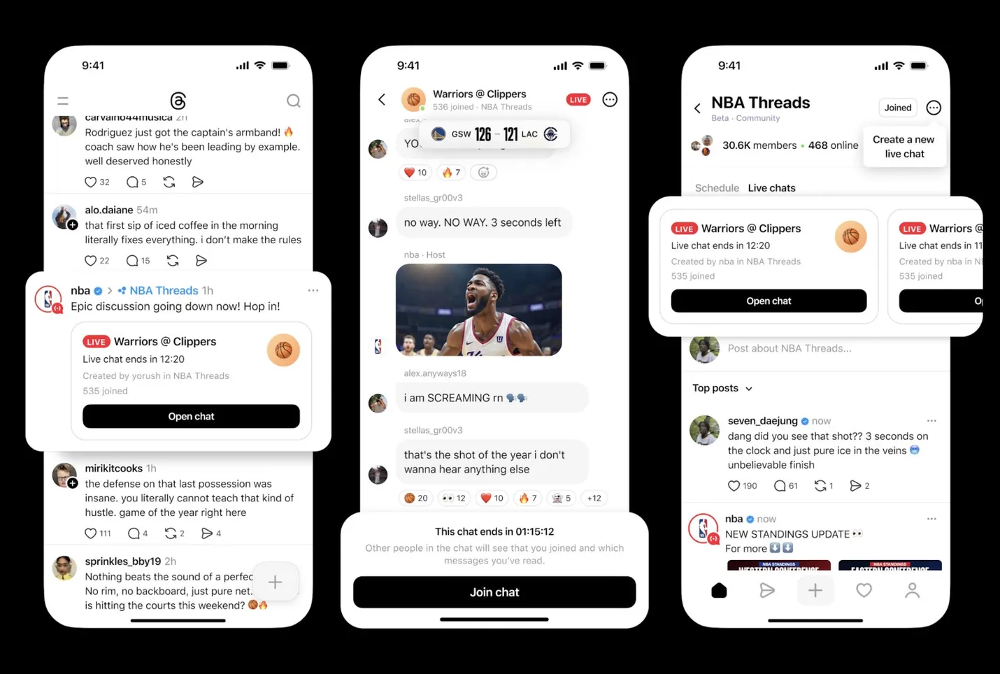 У Meta пояснюють, що «живі» чати створили для обговорень навколо великих культурних подій — наприклад, спортивних матчів чи музичних релізів. На старті вести такі чати зможе лише обмежене коло авторів, зокрема Community Champions — активні учасники конкретних спільнот, — а також медійні особистості. Серед перших ведучих у NBAThreads назвали Маліку Ендрюс, Рейчел Ніколс, Трісту Крік, Девіда Рашинга й Лексіса Мікенса.