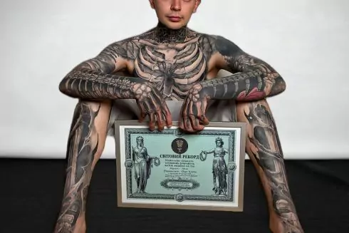 Українець Олег Карпа став новим світовим рекордсменом у сфері бодіарту, створивши на своєму тілі детальну анатомічну модель людського скелета. 28-річний мешканець Дрогобича побив рекорд легендарного канадця Ріка Дженеста (Zombie Boy). Про це повідомила очільниця Національного реєстру рекордів України Лана Вєтрова.