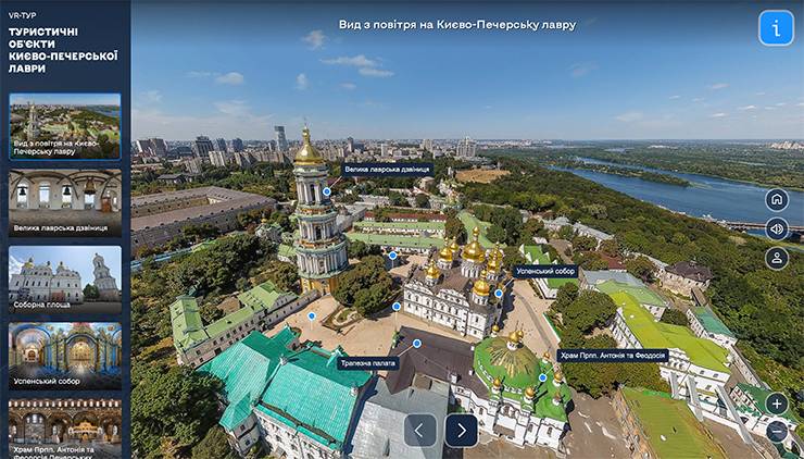 Крім цього усі охочі можуть віртуально прогулятись Києво-Печерською лаврою та уважно оглянути внутрішнє оздоблення Успенського собору, Храму Антонія та Феодосія, Трапезної палати, а також піднятись на Велику лаврську дзвіницю.