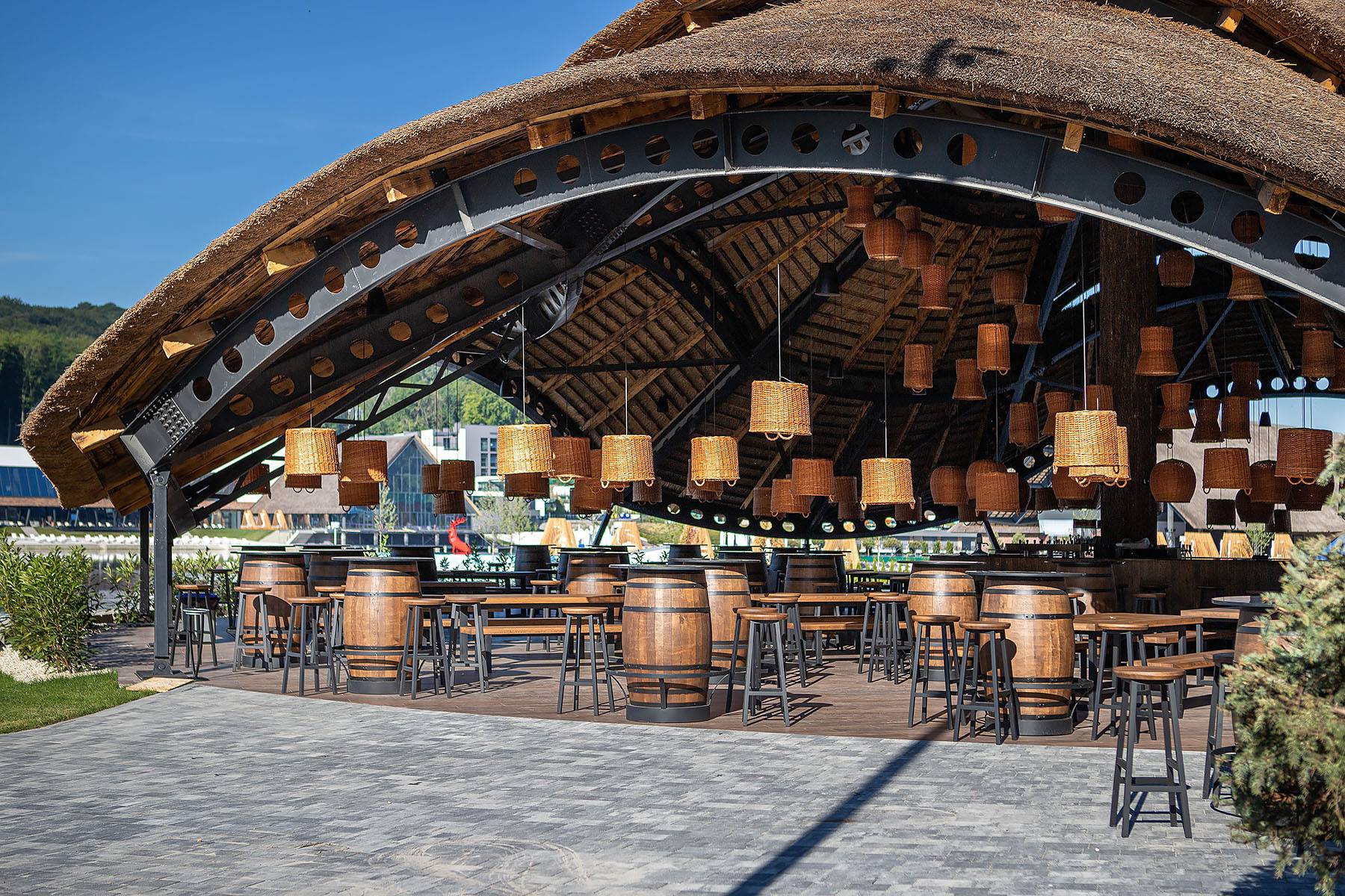 Meduza Food Court — ресторан просто неба, який за архітектурним дизайном символізує різну пору року: гора – зима, а хвилі – літо. Для будівництва ресторану конструкцію виконали із натуральних матеріалів, таких як дерево, очерет, камінь кварцит і т.д. Автори проєкту зазначають, що метал, який використовували під час будівництва, виробляли на “Азовсталі”, а плантації, з яких брали очерет, повністю знищені російськими військами.