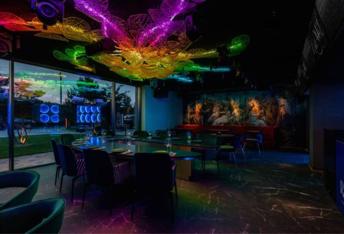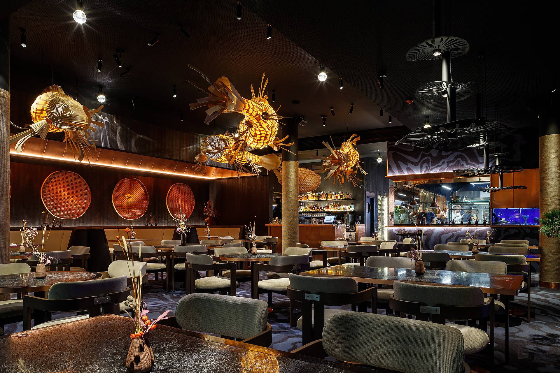 Зал було поділено на три частини. У водній зоні встановили панорамні вікна та акваріум, а в зоні вогню розмістили арт-об'єкт “Палаюче Сонце” на стіні та декор у вигляді вогняних риб.