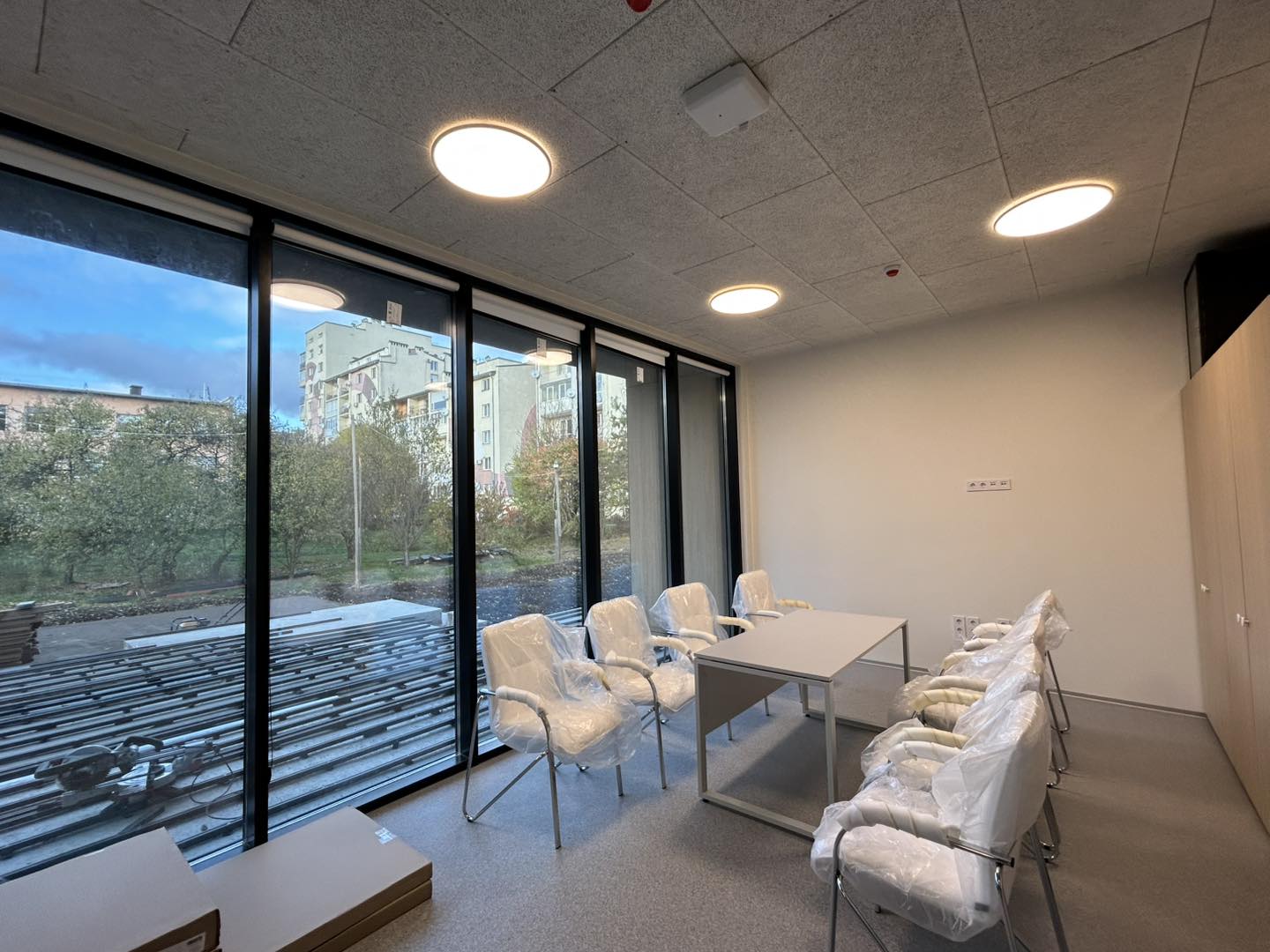 Класи вже обладнані сучасними партами, шафами й освітленням. Панорамні вікна додають простору і природного світла.