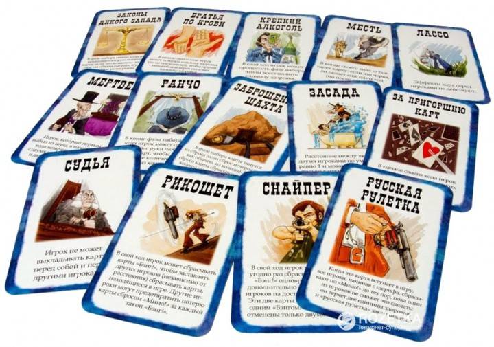 Ще є ігрові карти. Кожен набирає стільки карт, скільки куль йому дісталося на картці з персонажем. У цій грі багато нюансів, тому краще уважно читати правила.
