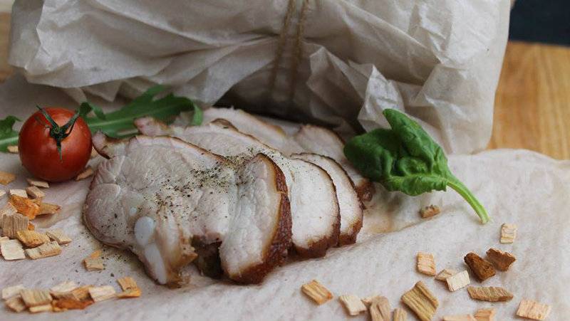 Этот гастропроект специализируется на горячем и холодном копчении мяса. Его, кстати, берут на Антоновском мясокомбинате. Перед копчением мясо натирают специями (соль, черный перец, паприка, чеснок и немного красного перца), отправляют в пленке в холодильник на 1-2 дня, затем обмывают, высушивают и тогда уже загружают в смоукер на 3-4 часа. При копчении используют щепу ольхи, черешни и яблони.