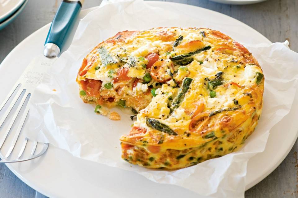 свіжа спаржа – 300 г ріпчаста цибуля – 1 шт. болгарський перець – 1 шт. цукіні – 1 шт. яйця – 5 шт. вершки – 1 склянка свіжа петрушка (рубана) – 2 столові ложки твердий сир – ½ склянки сіль/перець – за смаком