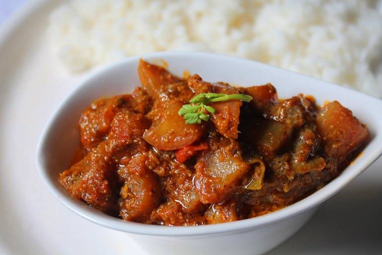 - Помити й порізати дольками помідори, додати їх у каррі, потім поперчити та посолити.