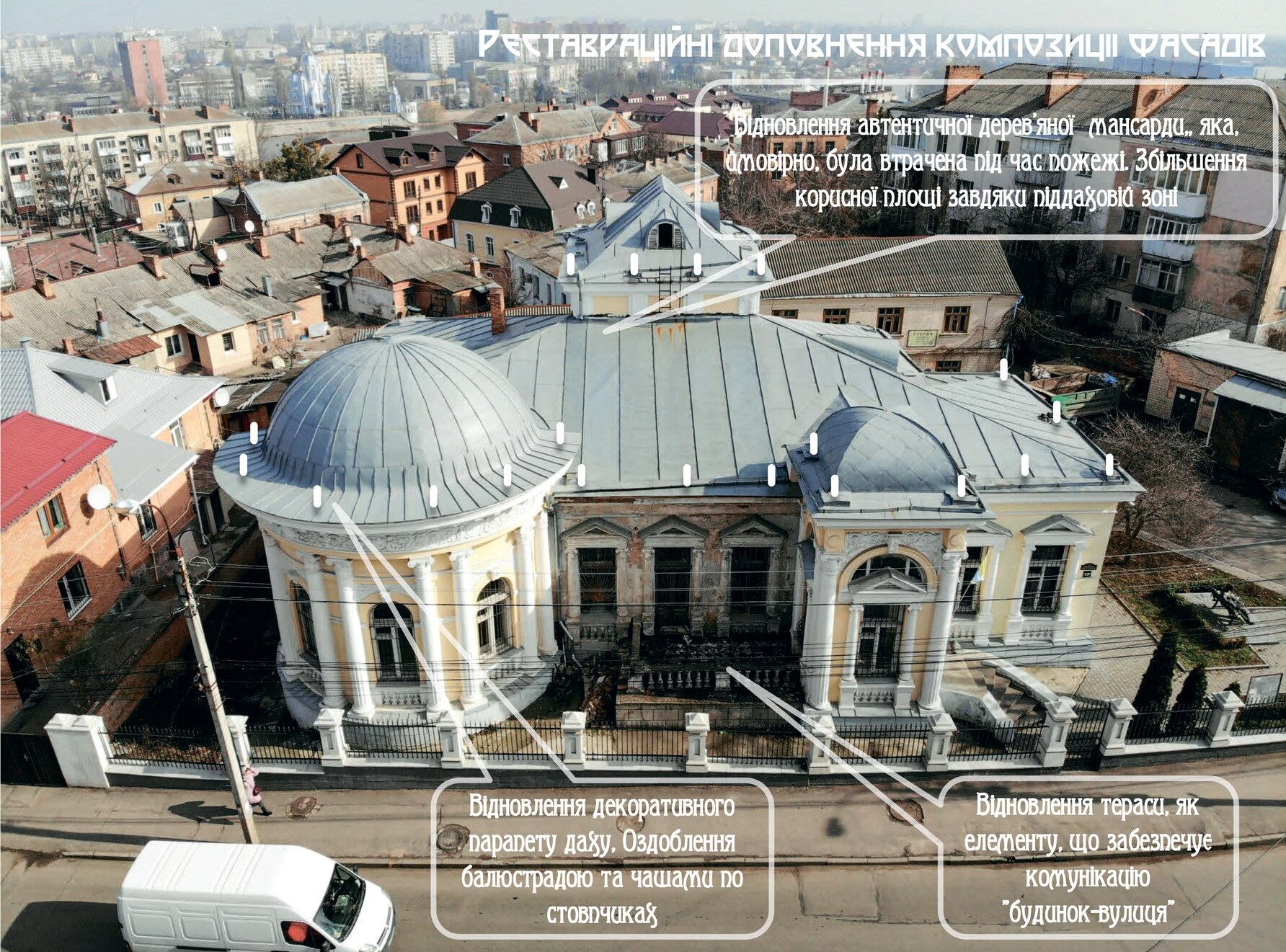 Зокрема, у межах реставрації зовні планують оновити фасади та впорядкувати прибудинкову територію, відновити мощення тераси, декоративні навершя башт на даху, а також відтворити втрачену автентичну дерев’яну мансарду та балкони.