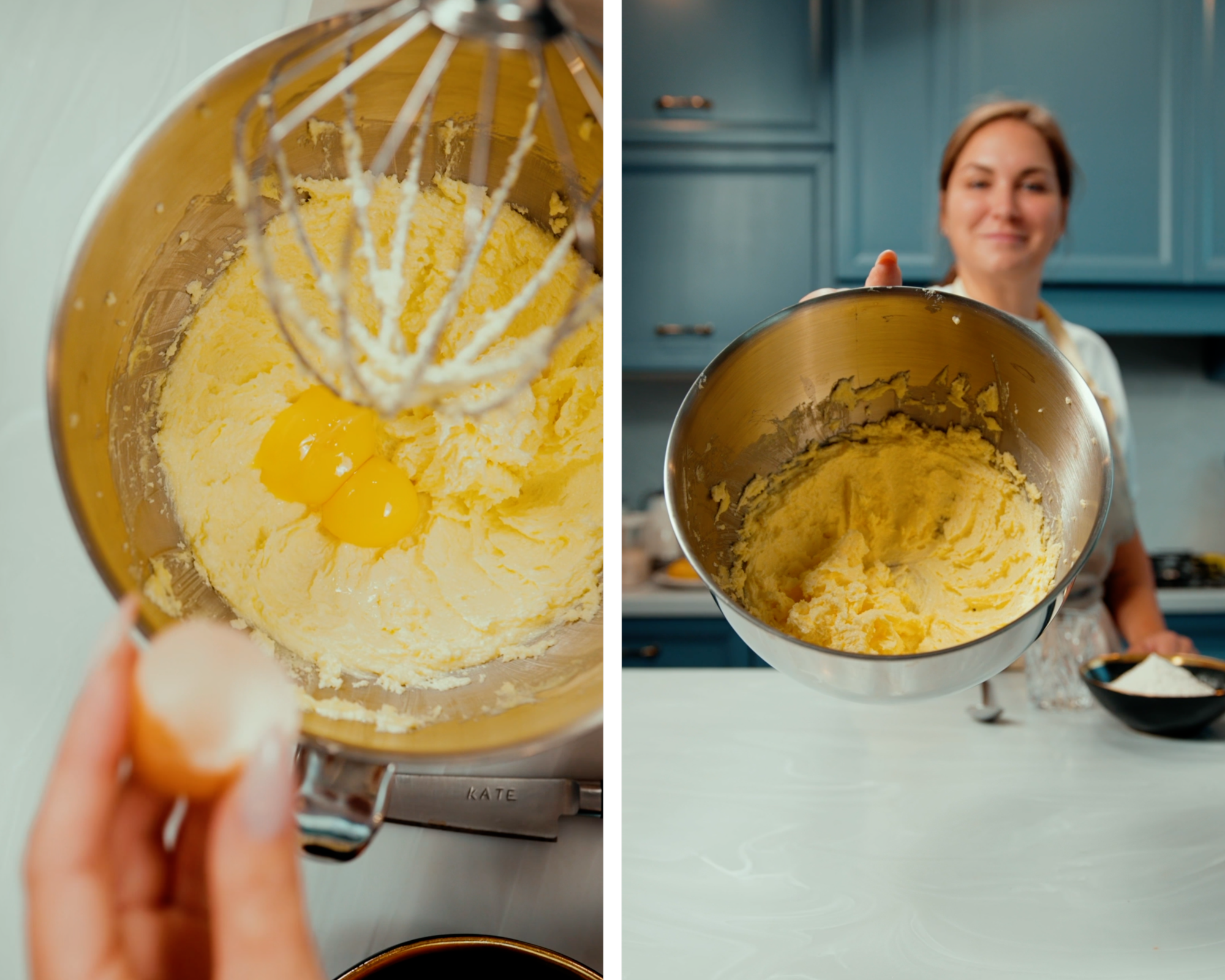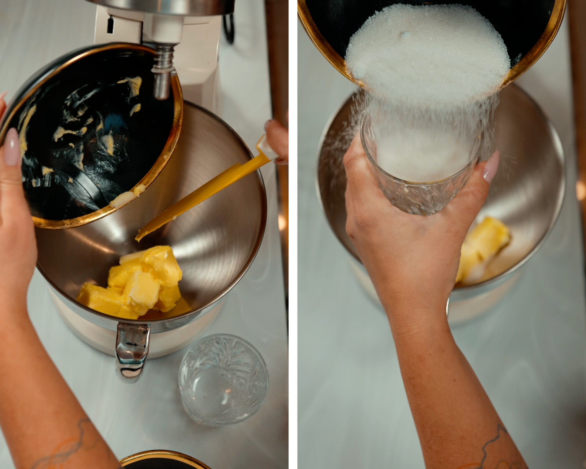 3. Масло збити міксером разом із цукром до світлої пухкої маси
