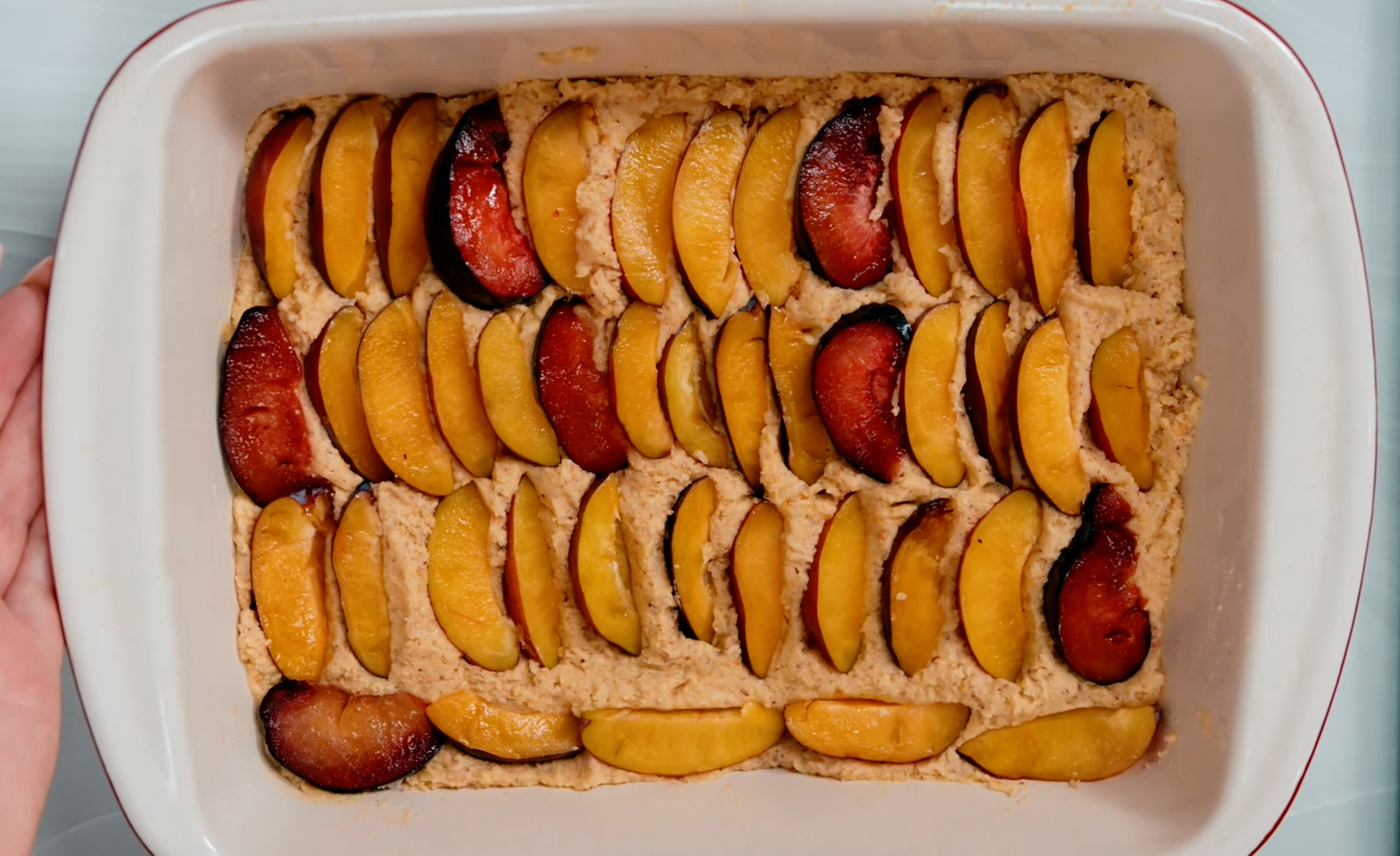 7. Форму змастити маслом, викласти тісто, а зверху розкласти сливи, трохи утоплюючи їх у тісті. Присипати цукром