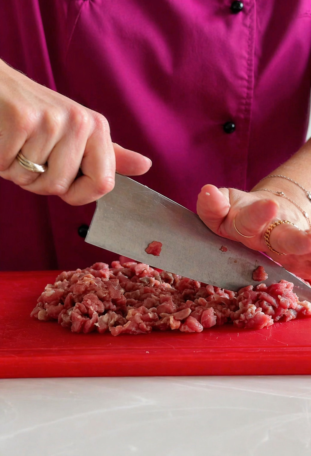1. Мʼясо зачистити й покласти в морозилку на 15 хвилин, щоб воно злегка підморозилось і його було легше нарізати. Нарізати мʼясо дрібними кубиками.